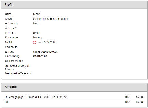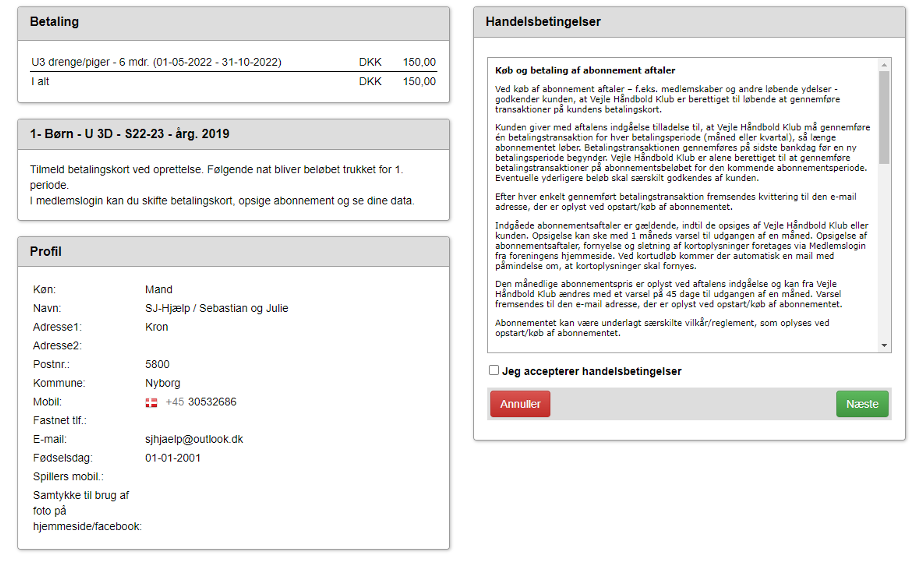 Indmeldelsesflow til abonnement Trin 1 - Opret Profil Første skridt er at oprette en profil med dine stamdata.Når profilen er oprettet, får du tilsendt en mail med dine log ind oplysninger til Conventus – vores medlemssystem. Trin 2 - Login på abonnementet Du skal bruge den tilsendte adgangskode til at logge ind.Dit brugernavn er den indtastede mailadresse. Trin 3 - Vælg en profil Her skal du vælge den profil, du ønsker at bruge.Hvis du har flere profiler oprettet på den samme mailadresse, vil der vises flere navne her. Trin 4 - Godkend medlemsoplysninger Du bliver bedt om at bekræfte dine medlemsoplysninger.Klik her på Næste, når de er rigtige. Trin 5 - Godkendelse af betaling Som næste skridt godkender du handelsbetingelser, holdet, du skal betale for samt betalingsintervallet. Trin 6 - Tast kontooplysninger Du skal taste dine kortoplysninger. Trin 7 - Godkend kort med MitID Du skal godkende din betaling med Mit-ID.OBS!! Når du bekræfter med Mit-ID, vises beløb 0,00 kr. Dette er en teknisk indstilling, det rigtige beløb trækkes, når du har godkendt med Mit-ID Trin 8 - Kvittering Du er færdig, og får tilsendt en mail med bekræftelsen på tilmelding.Kontingentet trækkes automatisk fremadrettet.Vi adviserer dig 7 dage før næste trækning.Du kan til en hver tid melde dig ud her på hjemmesiden. Stor tak til vores sponsorer